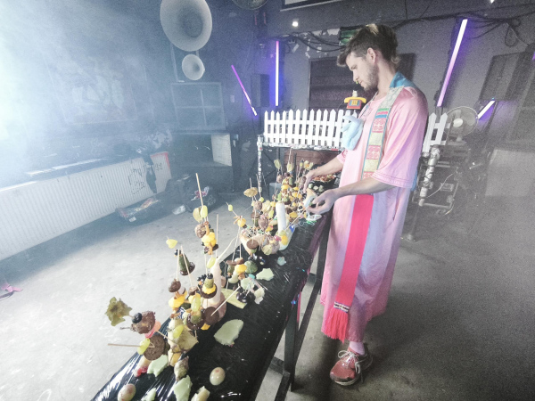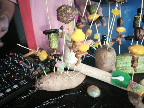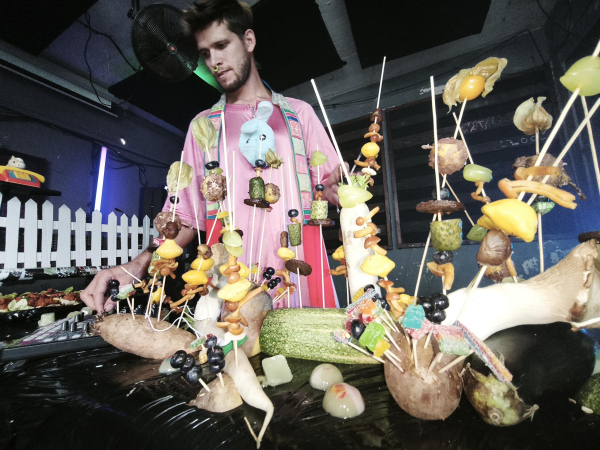 Interactive food installation with touch sensors. Guests of the party, by touching and taking food, were creating sounds, which were interacting in real-time with Peter's DJ set