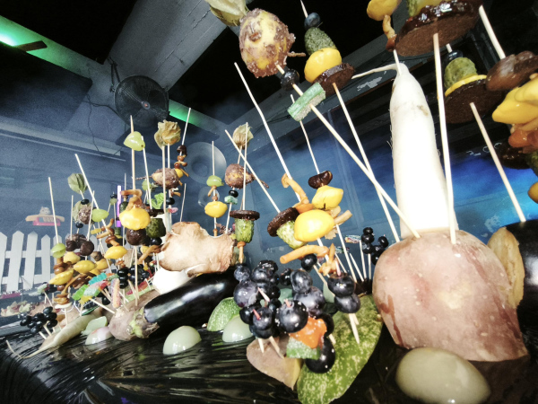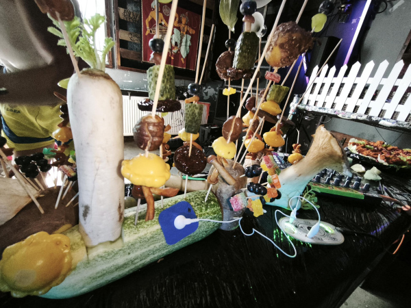 Interactive food installation with touch sensors. Guests of the party, by touching and taking food, were creating sounds, which were interacting in real-time with Peter's DJ set
